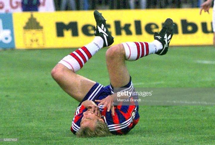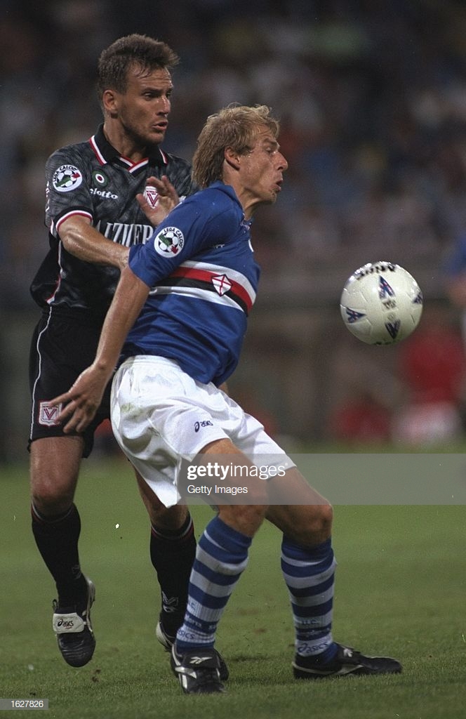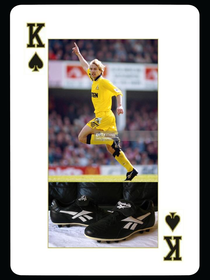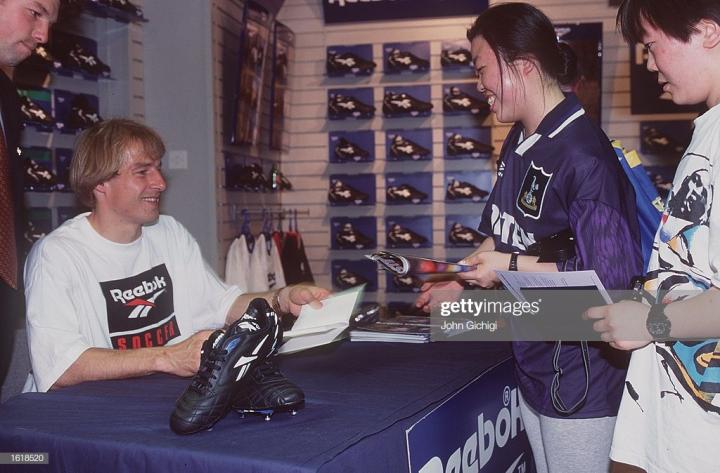 1994年世界杯之后,reebok签约了一位当时的重量级球星,那就是德国金色轰炸机克林斯曼,当时他刚刚来到英国加盟热刺,就为reebok的1994年款integrity代言,这款球鞋的外形非常经典,令人过目不忘,1994年世界杯上,很多球员都穿着这款球鞋。克林斯曼虽然当时在德国国家队只能穿adidas球鞋,但是在俱乐部可以穿的是锐步,在adidas大本营拜仁也是例外,当时在拜仁慕尼黑,只有他和马特乌斯两人使用非adidas球鞋。
