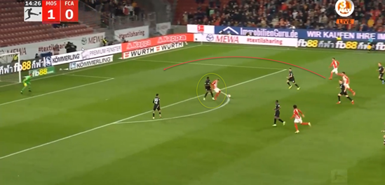 奥尼西沃在右路拿到了球,并希望通过传球来找到他的前锋搭档。伯卡特起初会在奥格斯堡后卫的内侧跑动,但他将改变方向,跑到后卫身后,原因有二:一是让后卫更难知道他的位置,二是让伯卡特能更好地抢点。