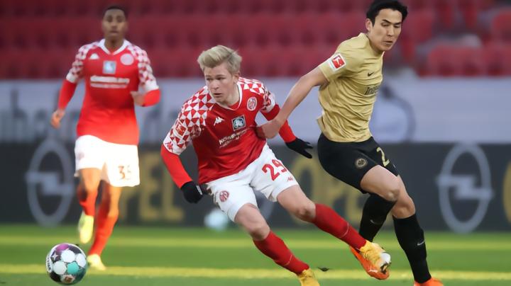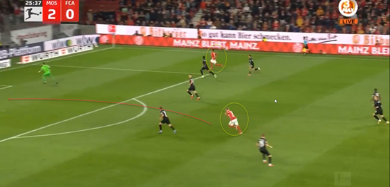 在控制住球以后,伯卡特用他的身体继续护球,并给前插的队友一个分量适中的传球,后者接球,为美因茨打进了他们当天的第二个进球。