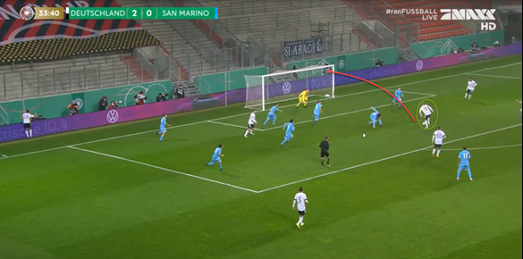 在对伯卡特进行战术分析时,他在禁区内寻找和创造空间的能力是不容忽视的。他在寻找小空间方面有很好的诀窍,他利用这些小空间进行射门和进球。这是所有伟大的前锋都有能力做到的事情。下面的例子来自德国21岁以下青年队对圣马力诺的比赛。正如我们所想象的那样,作为一个实力不足的球队,圣马力诺使用一个紧凑的五人防守阵容,并希望最大限度地减少德国队的进攻空间,伯卡特在下面场景中的右侧黄圈内。