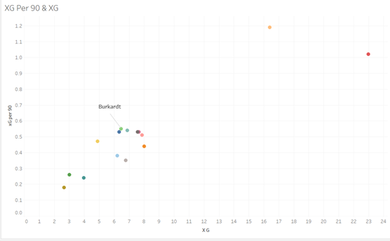 这促使我们要看看他的预期进球数,看看是运气,还是他能在本赛季剩下的时间里继续保持下去。下图显示了预期进球和每90分钟预期目标。伯卡特再次跻身德甲顶级攻击手之列,每90分钟XG为0.54,总XG为6.46。伯卡特目前正在超越他的XG,然而,这并不是太令人担忧的问题,因为这并不是一个特别难的数字,而且他在赛季剩余的时间有时间改变它。此外,在德甲顶级攻击手中,除了哈兰德和莱万外,伯卡特的每90分钟XG得分是最高的。这些数据帮助我们了解到,事实上,伯卡特的进球方式并不是运气,而是他出色的发挥让他进入了进球位置。