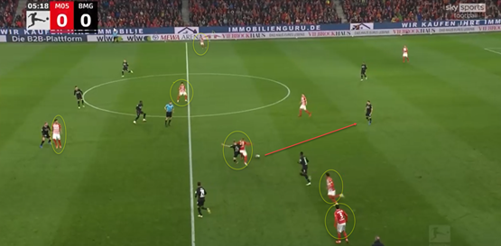 这是一种勇敢的行为,就好像如果成功,是令人印象深刻的表演,但这是在错误的地方尝试这种打法。虽然伯卡特的触球躲过了门兴格拉德巴赫的后卫,但是这名后卫成功地将球从他身边捅到了另一名进攻队员身上。在这个瞬间,它将美因茨的几名球员带出了比赛,并在一个危险的区域给了门兴格拉德巴赫球,如果他要作为一名球员取得进步,就必须在这方面下功夫。