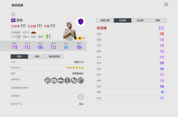 亮点属性(加成后):速度127、加速129、射门力量124、远射125