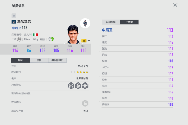 亮点属性(加成后):速度124、人盯人128、抢断126、头球125
