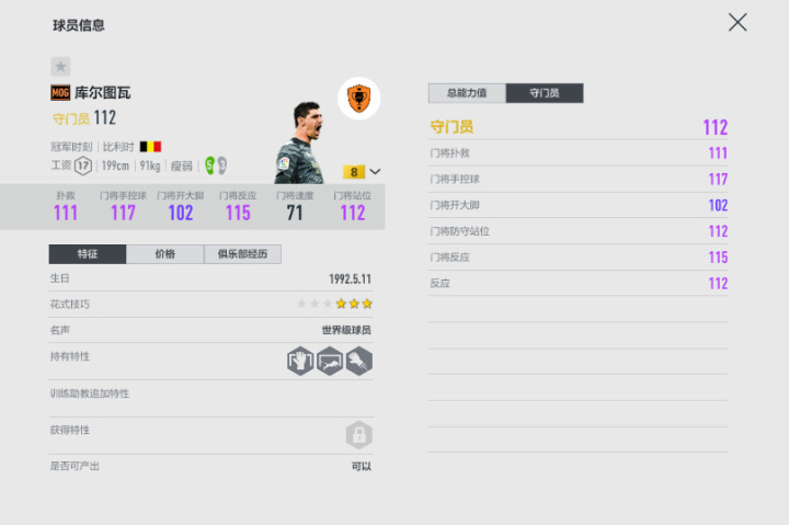 游戏里的库尔图瓦其实有EBS、21TS、MC和MOG多个赛季卡,但这张MOG赛季金卡是工资最低的,且能力一点也不逊色。从实战层面而言,库尔图瓦的最大优势就是199cm身高所带来的臂展优势,在扑救方面能够扩大防守面积,而且有大力手抛球、冷静处理单刀球的两个实用特性,因此无论哪个赛季的库尔图瓦实战稳定性都是很高的。这张MOG赛季卡虽然说属性方面没有特别突出的地方,但17工资的门将里面他几乎是最突出的了,也基本上没有犯低级失误。玩家可以给他搭配防搓射的助教,进一步提升他的扑救能力。