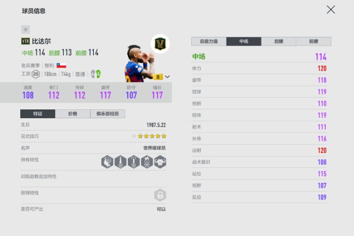 亮点属性(加成后):体力129、控球128、短传128、远射129