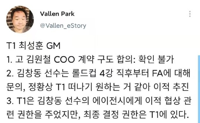 通过和选手的短信以及口头交流,得知Canna选手第一希望恢复自由人身份,第二希望是留在T1,并且Canna选手多次向我和其他T1工作人员咨询自由人一事,尽管选手还在合同期间,但数次询问让我们认为他希望离开战队,因此我们决定推进转会。