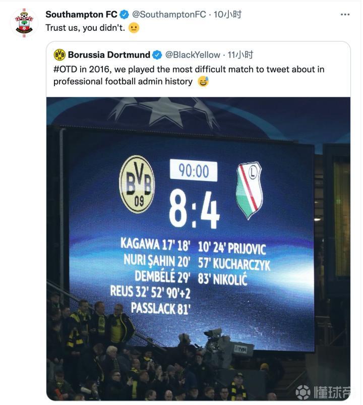 多特官方晒出了一张5年前他们在欧冠8-4战胜华沙莱吉亚的比分图,并表示这是职业足球社媒管理员最难更新动态的比赛,曾两次在英超输了0-9的南安普顿官方对此并不认同。