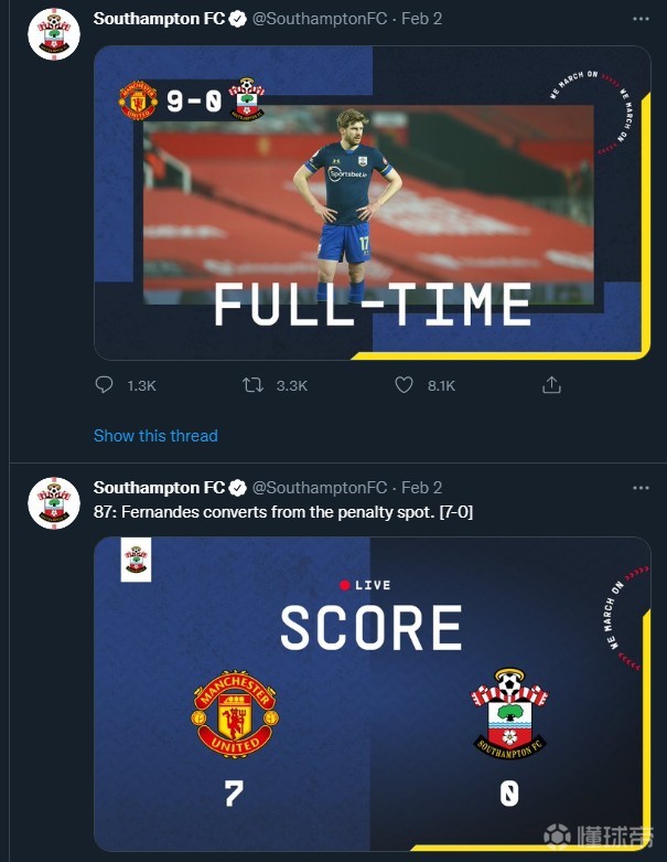 过去两个赛季,南安普顿在英超以0-9的比分分别输给了莱斯特城和曼联。南安普顿官方社媒小编的这番操作无异于“铁锅炖自己”。