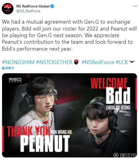 Thank you Bdd, welcome Peanut!通过与NS战队的交易,我们遗憾同‘Bdd’郭普成选手道别。能和Bdd选手一起朝着顶峰并肩奋战两年是我们的荣幸,Gen.G LoL将永远记得我们与Bdd选手的每一个瞬间。