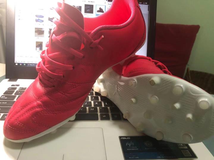 总结:鞋底较窄,对宽脚朋友不友好,FG鞋钉较长适合人工草特别厚实或者是天然草,能有效提供启动、加速、变向的动力,同时又不会给足部带来负担。(后来我用壁纸刀和锉刀愣愣的将鞋钉干到1cm左右)鞋面:PU皮革的硬度能缓解被对方踩时的的的痛苦,同时射门发力也更有力。