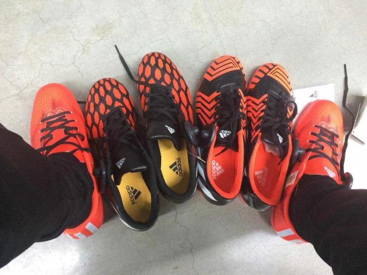 照片里为红龙和猎鹰14的两款不同外形的足球鞋,颜色都是我中意的红黑配色,最终选择的是右边这双TF版这双是中端,在迪卡侬实体店购入。能适应各类场地,也是穿着频率最多、最耐造的一双。
