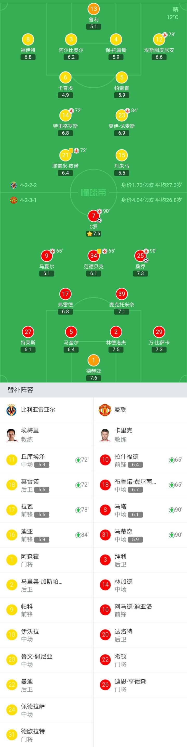 比利亚雷亚尔首发:13-鲁利、8-福伊特、3-阿尔比奥尔、4-保-托雷斯、5-帕雷霍、6-卡普埃、12-埃斯图皮尼安(79'17-拉瓦)、14-特里格罗斯(73'18-阿尔贝托-莫雷诺)、15-丹朱马、21-耶雷米-皮诺(73'11-丘库埃泽)、23-莫伊-戈麦斯(84'16-迪亚)