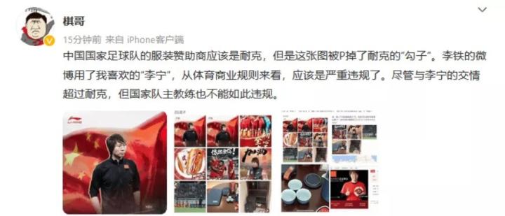 原国家体育总局中体产业集团中体竞赛管理集团常务副总裁王奇就表示,李铁的商业团队抹掉国家队服装赞助商耐克的商标而使用李宁,应该是“严重违规”行为。