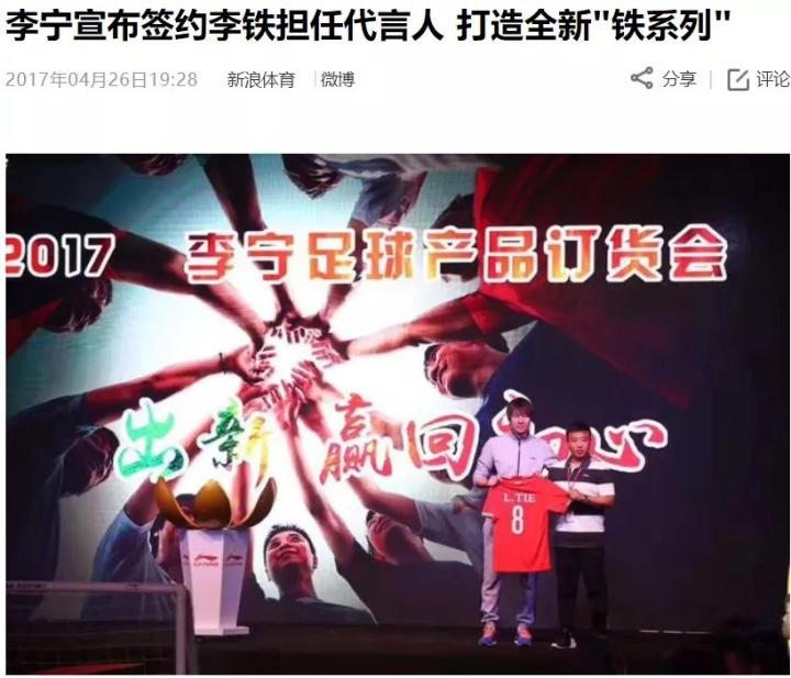 2017年4月26日,李铁再次与李宁公司签约。李铁随后在发布会上表示,“十几年来与李宁的合作一直没有中断。”