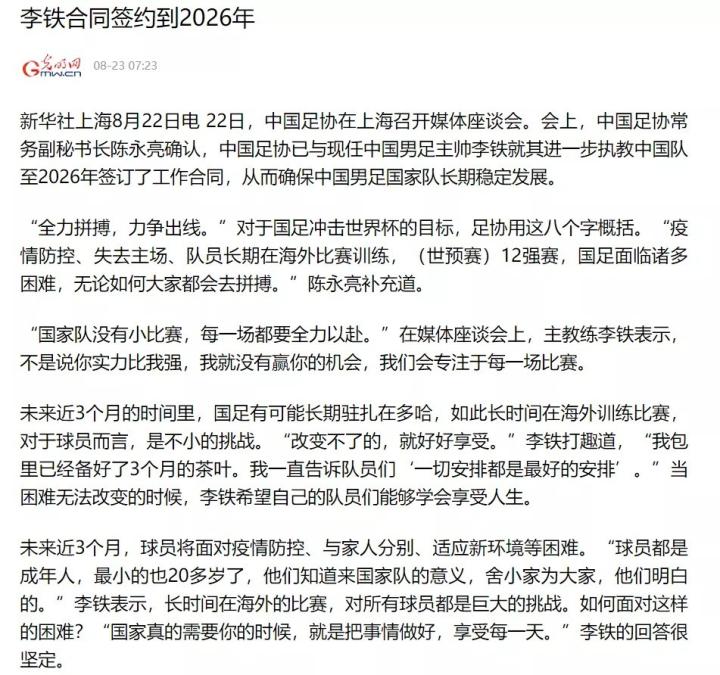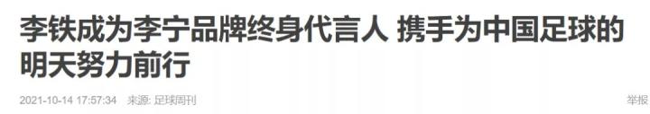 文中提及:“一如在本届世界杯预选赛12强赛开打前,国足主帅李铁与李宁已经达成续约意向,一份意味深远的终身合约,将让他们继续在中国足坛开拓进取。”