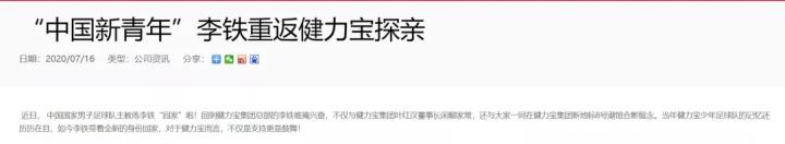在健力宝官网《“中国新青年”李铁重返健力宝探亲》开篇便描述道:近日, 中国国家男子足球队主教练李铁“回家”啦!回到健力宝集团总部的李铁难掩兴奋,不仅与健力宝集团叶红汉董事长闲聊家常,还与大家一同在健力宝集团新地标8号潮馆合影留念。