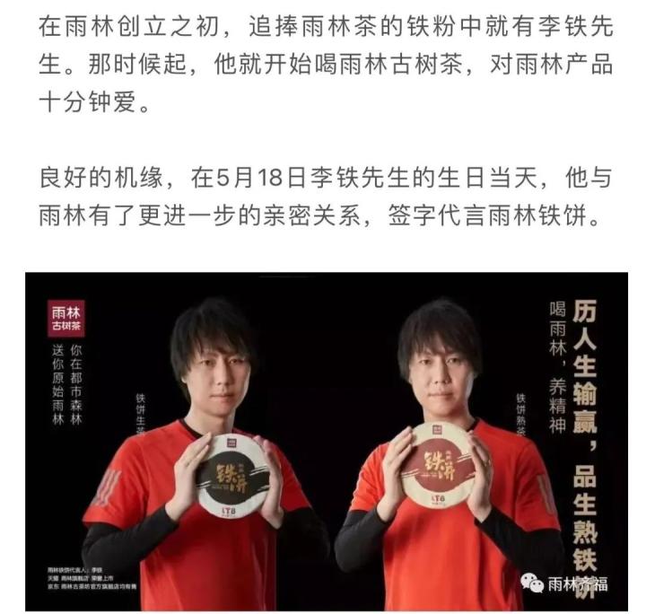 雨林古茶坊公开消息称,李铁是在2017年5月18日生日当天签字代言雨林铁饼的,而地点则选在沈阳李铁足球公园,当天也是该公园的开园庆典。
