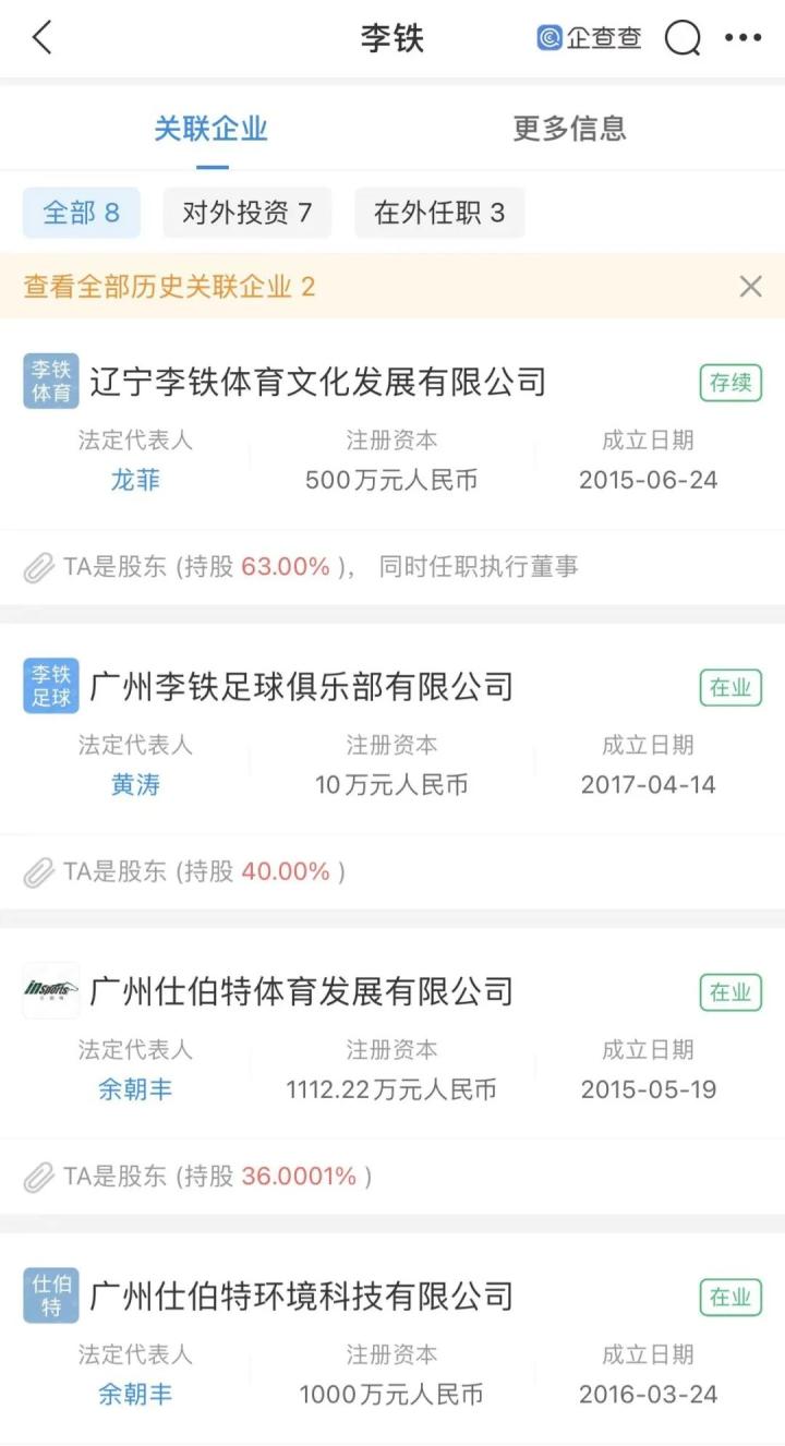 处于存续状态的企业有两家:包括辽宁李铁体育文化发展有限公司,注册资本500万元,李铁作为大股东持股比例为63%;沈阳李铁足球俱乐部有限公司,注册资本110万元,李铁持股9%;注销两家:包括浙江铁子帮体育交流策划发展有限公司和铁众享体育文化发展控股有限公司;吊销一家:杭州铁子帮众享体育文化策划有限公司。处于在业状态的有三家:包括广州李铁足球俱乐部有限公司,注册资本10万元,李铁持股40%;广州仕伯特环境科技有限公司,注册资本1000万元,李铁持股25.5%。