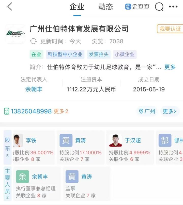 据企查查显示:该公司成立于2015年5月,注册资本为1112.2万元,李铁为第二大股东,持股比例36%。值得一提的是,现役球员于汉超和郜林也是这家公司股东,各自持股4.9%。