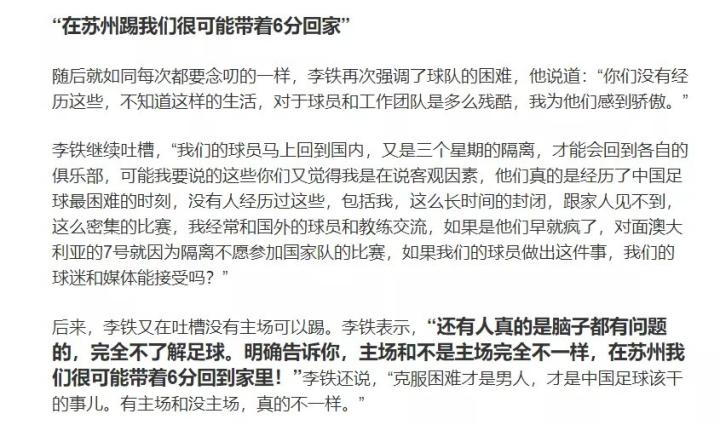 比如他赛后发布会上诉苦道:“我们的球员真的是经历了中国足球最困难的时刻,没有人经历过这些,包括我,这么长时间的封闭,跟家人见不到,这么密集的比赛,我经常和国外的球员和教练交流,如果是他们早就疯了,对面澳大利亚的7号就因为隔离不愿参加国家队的比赛,如果我们的球员做出这件事,我们的球迷和媒体能接受吗?”