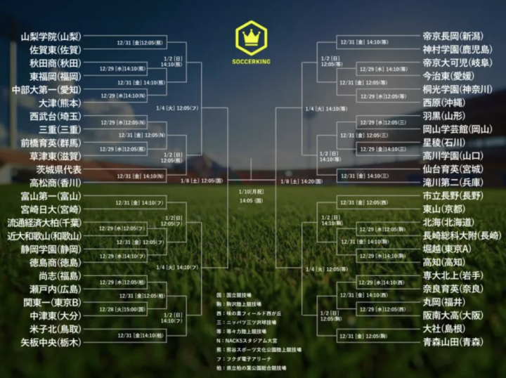 全国大会是每年高中足球的重头戏,俗称“选手权(锦标赛的日文)”、“冬天的国立(因决赛在国立竞技场进行)”等等。于每年12月底到次年1月之间展开(过去是元旦开幕)。参赛球队为48支,由全日本47个都道府县(相当于我国省级行政区)的地方大会冠军参赛,东京都则分为A、B两组,产生2支代表队。