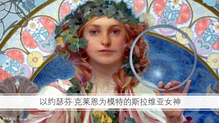 布拉格斯拉维亚位于捷克首都布拉格东部的第十区,斯拉维亚一词是斯拉夫神话中的女神斯拉瓦(Sláwa)的拉丁语转写,她是收获和领土的保护者。斯拉维亚在古代只存在于文字描述中,捷克著名艺术家阿尔方斯·穆夏是最早将其具象化的,他以美国首任驻捷克斯洛伐克大使理查德·克莱恩的女儿——约瑟芬·克莱恩为模特,画出了斯拉维亚女神的形象。