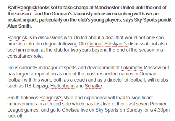 拉尔夫.朗尼克看起来即将成为曼联临时主帅,任期至本赛季结束。天空体育足球专家阿兰.史密斯认为这位工作细致的德国知名老帅将能立刻给红魔带来改变,尤其是在俱乐部年轻球员的培养方面。