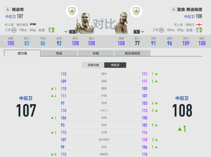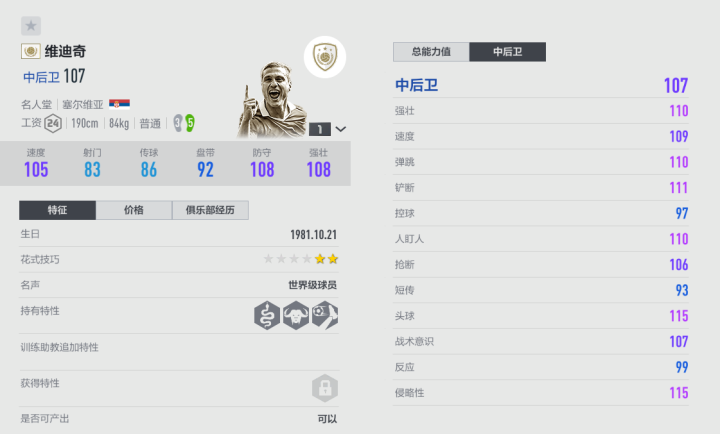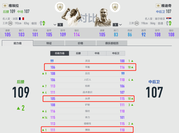 身高维埃拉高2CM,而弹跳维埃拉多1点,这些根据实战效果来看,差别并不明显;而争顶高空球时“平衡”属性非常重要,高平衡的中卫对前锋的干扰效果更好,会促使其出现顶偏或发力不足的情况,这一点维迪奇的优势非常大。 而当我方获得前场定位球时,维迪奇的头球属性和“强力头球”特性也有用武之地,将成为一个比较大的威胁点。单就空战效果来说,ICON维迪奇已经是现有球员里,强度非常高的选择了。