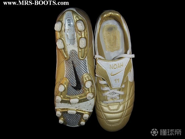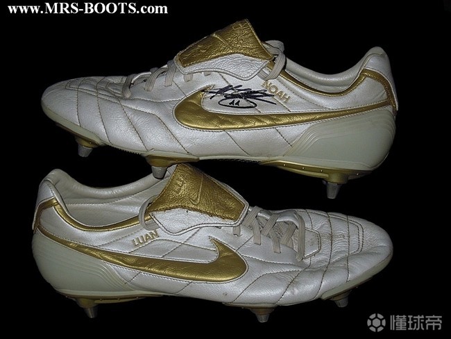 在耐克旗下米洛长期代言传奇,但是最早他是穿T90系列的,因为那时候传奇还没有出世。2005年的Air Legend小罗专属白金配色是耐克为新登基的世界之王特别推出的配色,鞋舌上“R”“10”的刺绣也具有非常鲜明的个人特点,无论是当时还是现在,这双鞋都是小罗迷和足球鞋迷梦寐以求的神物。耐克给了小罗超人一等的待遇,除了小罗基本没看到有其他签约球员穿这款,但是这个配色克洛泽却长期穿,并且鞋舌去掉了小罗元素的“R”“10”刺绣,以孩子的名字代替。白金之后耐克为小罗做了第二款专属配色,把金色和白色区域互相调换,就是2006年世界杯上小罗穿的那双金靴,这个配色克洛泽也同样上脚。