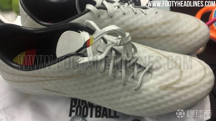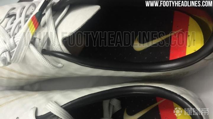 巴西世界杯后耐克曾为克洛泽推出过一款真正意义上的专属球鞋,充满了克洛泽元素和纪念意义。这是一双特别版的毒蜂,配色是老K最爱的白金色,白色为底,金色点缀,鞋面材质应该是真皮,厚重程度上接近球员脚上那双定制,不似NikeSkin那般轻薄。鞋垫、大底和鞋带有德国国旗的颜色,后跟处有一处图案,印有“KLOSE”“16”等信息,16代表克洛泽在世界杯赛场打入的16粒进球,数字周围是16颗星星,每颗星星代表一粒进球。图案最下方则是球鞋编号。