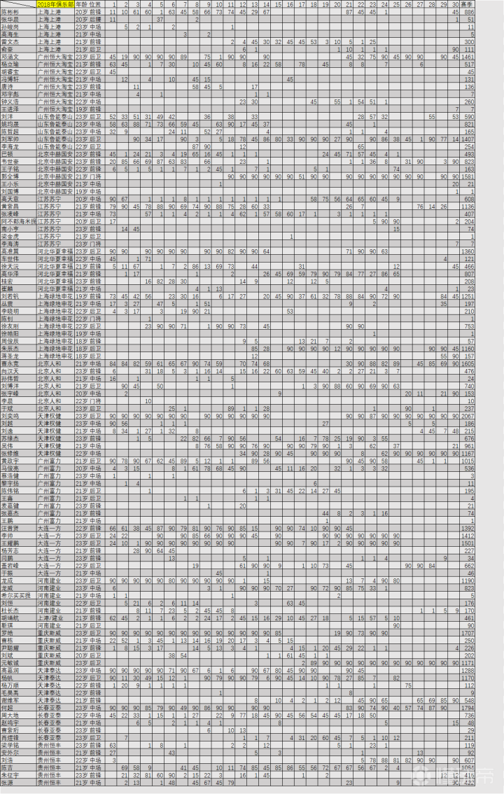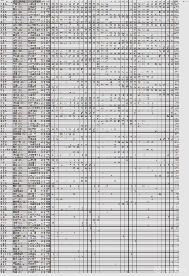 2018年中超联赛U23球员出场时间统计(第一张...