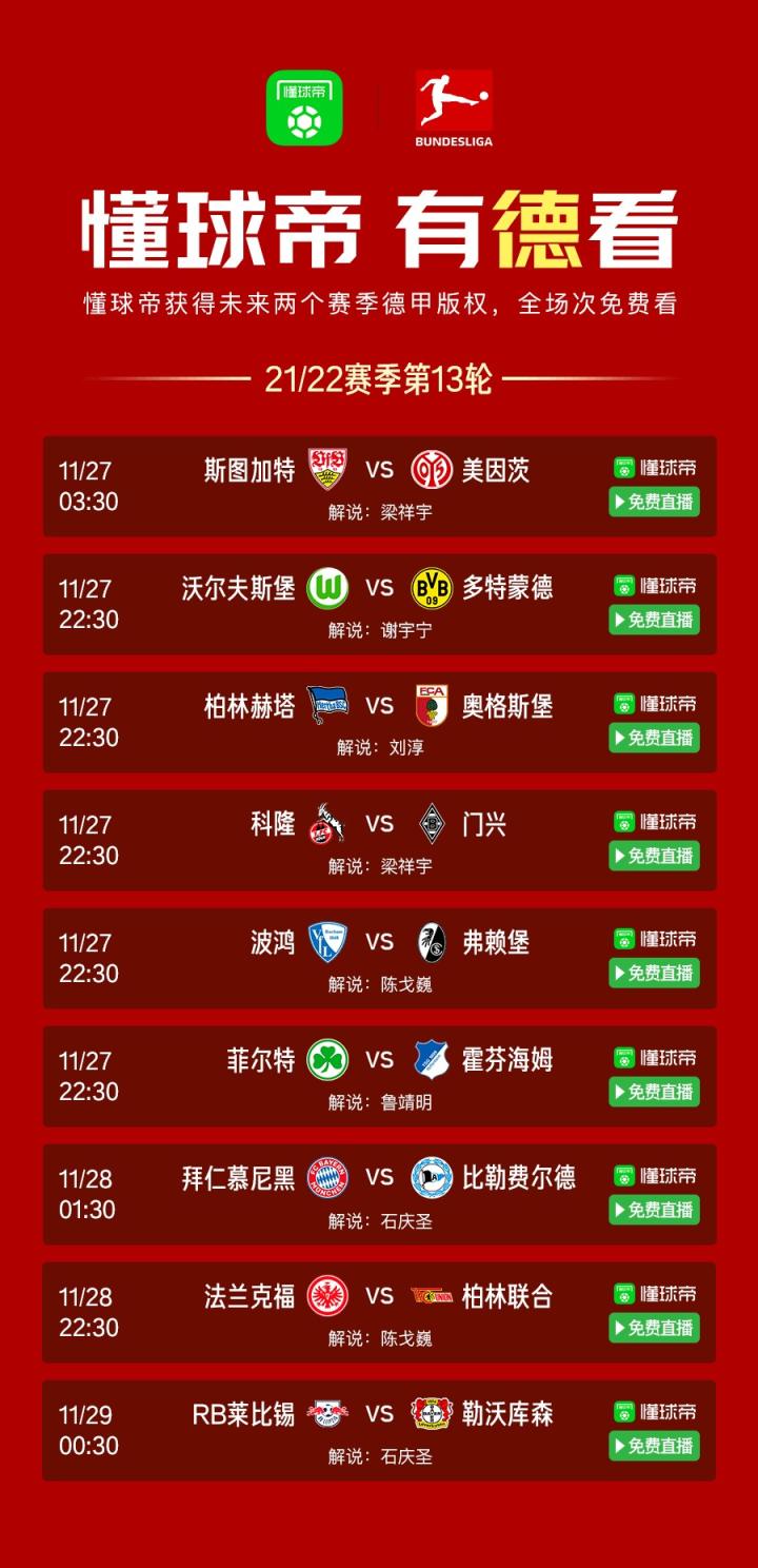 北京时间今晚及明日凌晨,五大联赛将继续进行多场比赛。懂球帝将为大家带来德甲联赛全场次视频直播,@评论员-陈戈巍 将在22:30为大家带来法兰克福vs柏林联合的解说评述, 另一场于凌晨0:30开赛的RB莱比锡vs勒沃库森的解说评述由@足球解说-石庆圣 为大家带来~