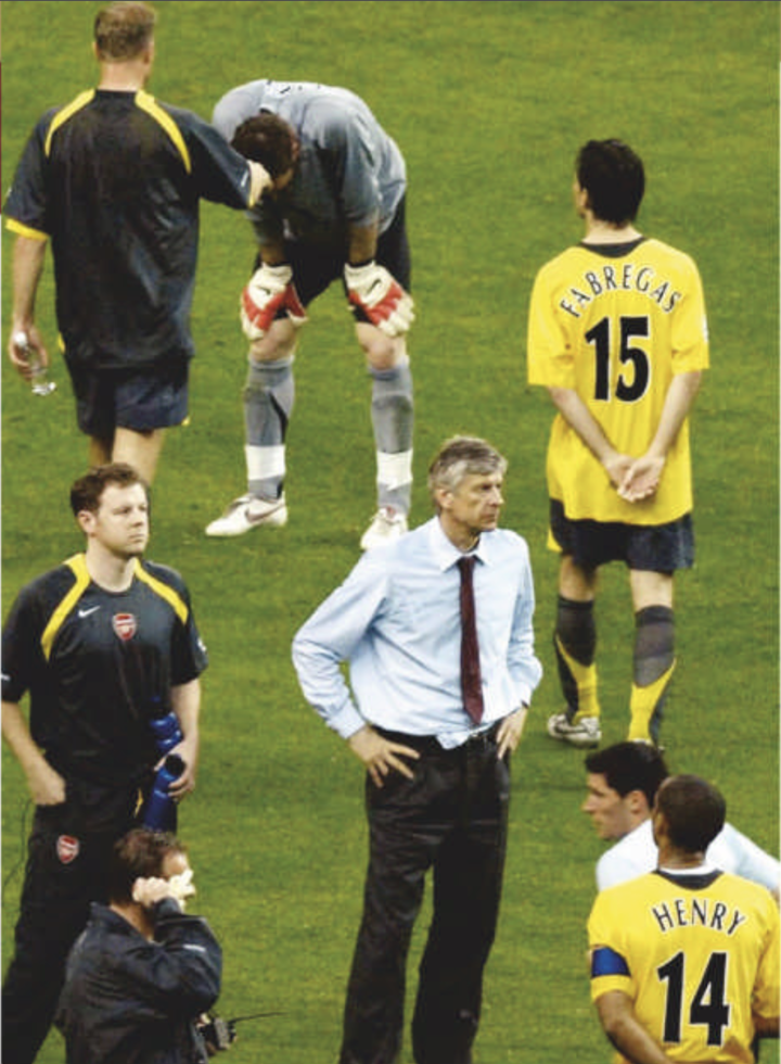 与巴萨的欧冠决赛开场仅18分钟,延斯·莱曼(门将)被罚下场。最终阿森纳遭巴萨1-2逆转,无缘欧冠冠军。在那之前枪手保持小组赛不败,一路淘汰皇马,尤文图斯,比利亚雷亚尔来到巴黎。温格一直不忍心回看这场比赛的录像。