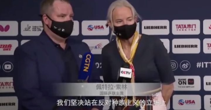 国际乒联主席佩特拉·索林在接受央视采访时也强调:“我们坚决反对种族主义!国际乒联倡导的‘乒乓球全人类共享’不只是口号,而是客观事实。”