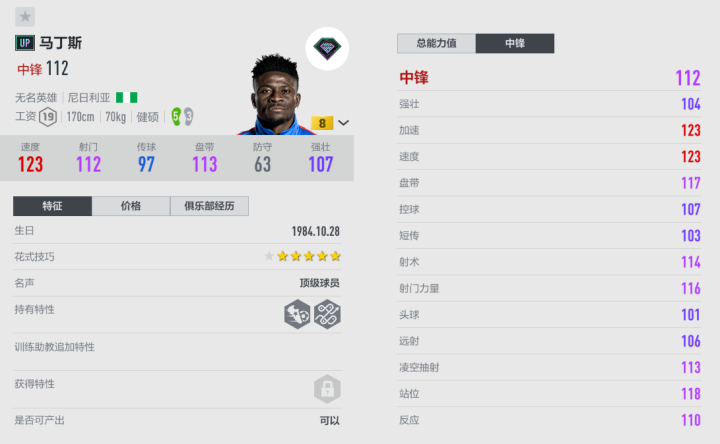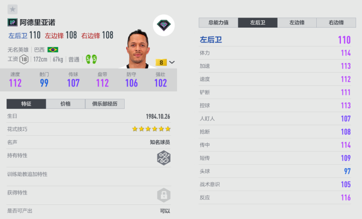 如上图所示,他是少有的双五脚边后卫,也就是说可以出任左后卫或右后卫,可以说一人撑起两条路。UP阿德里亚诺8强的价格便宜,且满加成后速度、加速都在120以上,因此建议小伙伴们购买金卡。