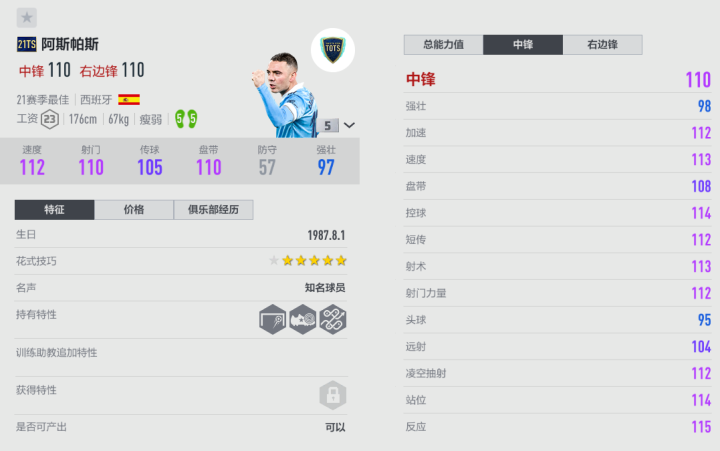 这张阿斯帕斯是双五脚,左右两边都可以传射,提高了他一脚传球和抢射的成功率;阿斯帕斯的体型瘦弱、拿球手感轻盈、盘带效果好,能够在狭小空间里过人突破;阿斯帕斯可以打中锋和边锋,凭借着优秀的跑位意识和高爆发力,他对防线有着极大的威胁度;不足之处在于对抗不稳定,重心无法有效保持平衡,所以需要尽量躲避身体接触。