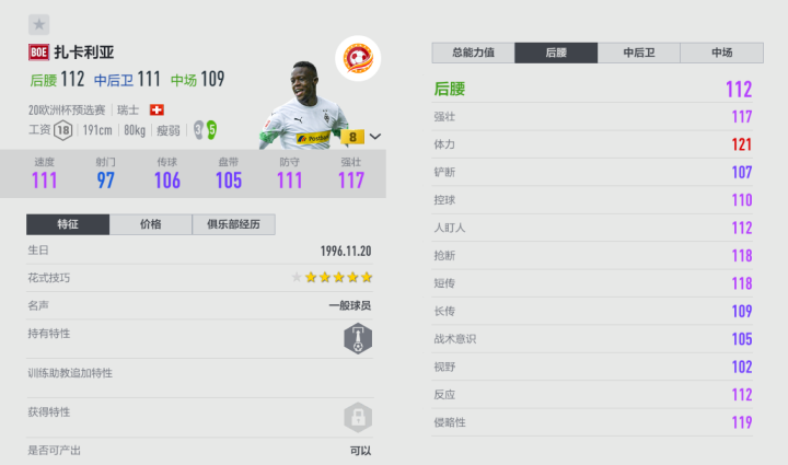 扎卡利亚的短板是灵活性有所欠缺,防守灵巧性球员稍显吃力,需要其他防守球员的协防。作为一名价格便宜、工资实惠的优秀妖人后腰,BOE扎卡利亚几乎是玩家必备的选择,他能让防守更加稳固,“黑又硬”值得信赖。