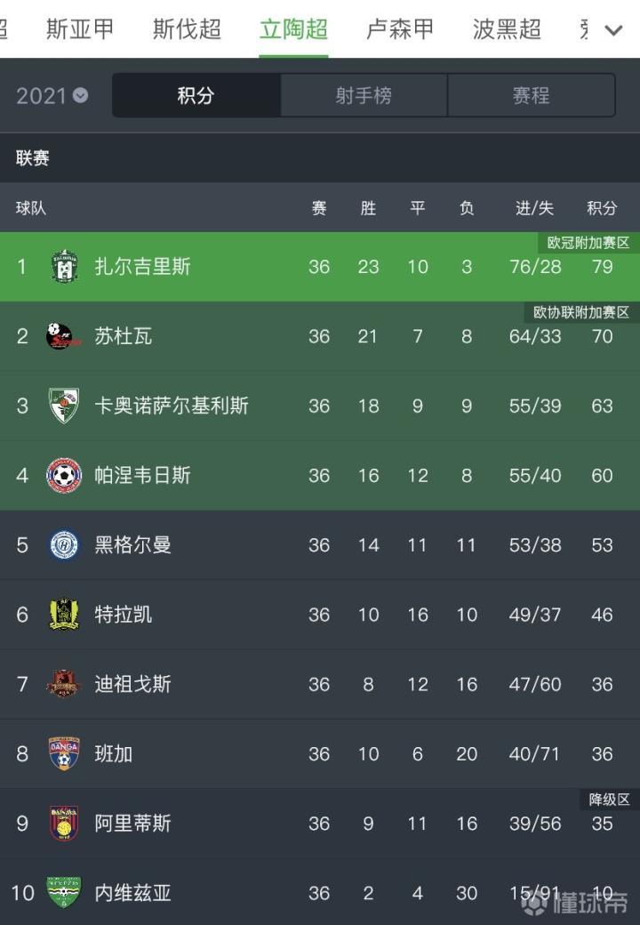 11月28日,2021赛季立陶宛足球超级联赛落幕,扎尔吉里斯时隔5年再次夺冠。 扎尔吉里斯从2013年到2016年连续4年获得联赛冠军,之后苏杜瓦从2017年到2019年完成三连冠。2020年因为疫情并没有决出冠军。 本赛季扎尔吉里斯获得联赛、杯赛双冠王,获得了下赛季欧冠附加赛资格。联赛2-4名将参加欧会杯附加赛。 立陶宛国家面积6.53万平方千米,仅有安徽省一半的大小,全国人口279万,相当于石家庄的人口数量。立陶宛的首都是维尔纽斯,属于世界三线城市,弱于青岛、苏州、昆明,强于福州、哈尔滨。 值得一提的是,立陶宛是名副其实的足球小国,篮球大国,他们足球仅排世界第136,篮球高居世界第9。