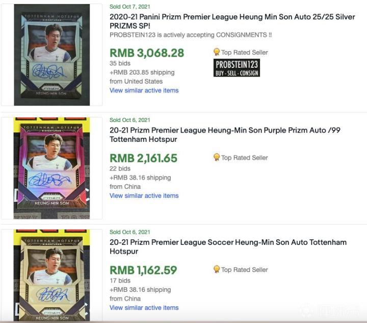 分别是孙兴慜的普通版签字,限量99张紫色平行版签字以及限量25张银色平行版签字的成交价格。可以看出,编数越低,价格越高。