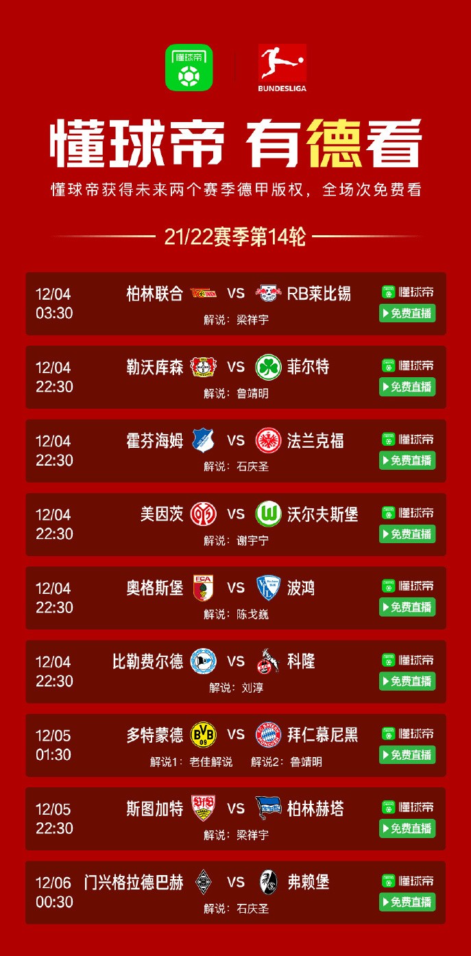 北京时间今晚及明日凌晨,五大联赛将继续进行多场比赛。懂球帝将为大家带来德甲联赛全场次视频直播,其中@鲁靖明 、@足球解说-石庆圣 、@谢宇宁 、@评论员-陈戈巍 、@足球解说员刘淳 将在22:30分别为大家带来勒沃库森vs菲尔特、霍芬海姆vs法兰克福、美因茨vs沃尔夫斯堡、奥格斯堡vs波鸿、比勒费尔德vs科隆的解说评述,@鲁靖明 与@老佳解说 将在凌晨1:30为大家带来多特蒙德vs拜仁慕尼黑的解说评述~