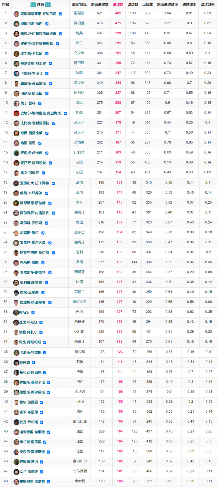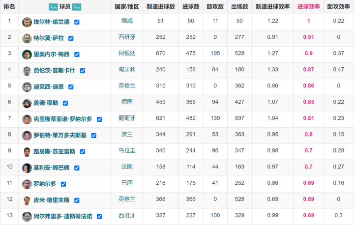 这些球员都是当世最顶级的球员,相比于上世纪90年代至新世纪00年代,如今的这一代球员由于各种因素时代浪潮的推进,现代足球整体进球效率要高于上一个时代的球员。那个年代中,五大联赛进球效率超过0.6的球员便已经是天花板了。