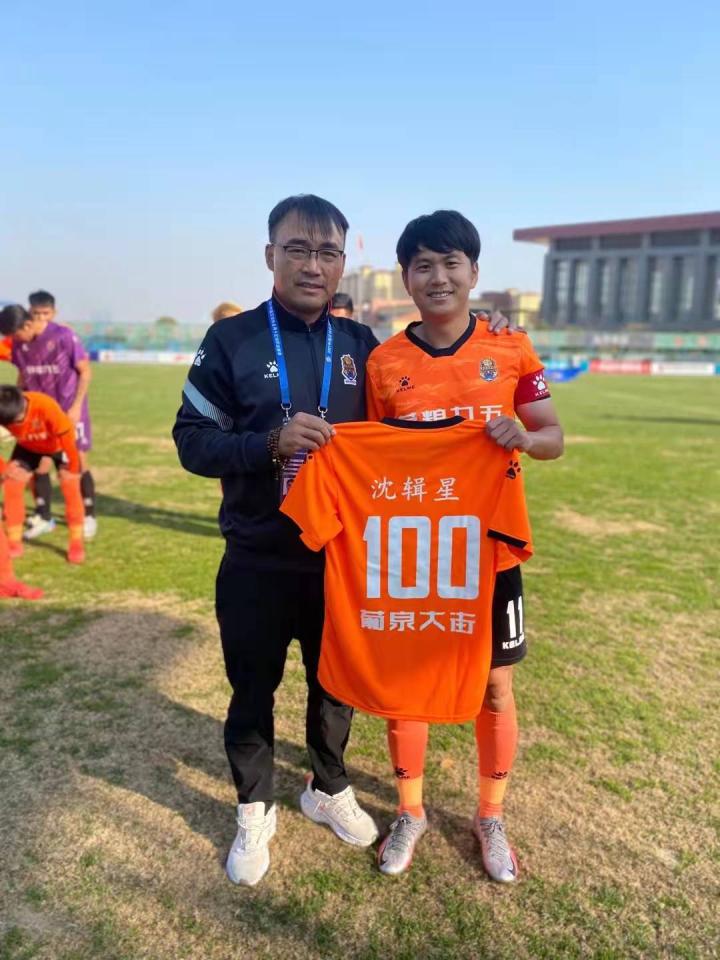 今天是昆明郑和船工球员沈辑星个人职业足球生涯第100次出场比赛。比赛开始之前,球队主教练和云群代表俱乐部赠送沈辑星100场纪念球衣并合影留念。