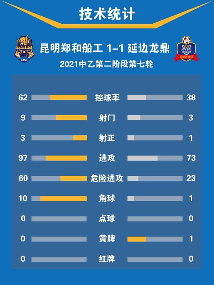 今天下午14点中乙联赛第二阶段第七轮的一场比赛在盐城赛区率先打响,昆明郑和船工对阵延边龙鼎。上半场第8分钟,延边龙鼎左路下底传中头球顶进空门;下半场第69分钟,对方后卫传球失误,李彪抢断兜射破门,帮助球队扳平比分。90分钟战罢,昆明郑和船工与延边龙鼎最终以1-1的平局为2021赛季画上圆满句号。