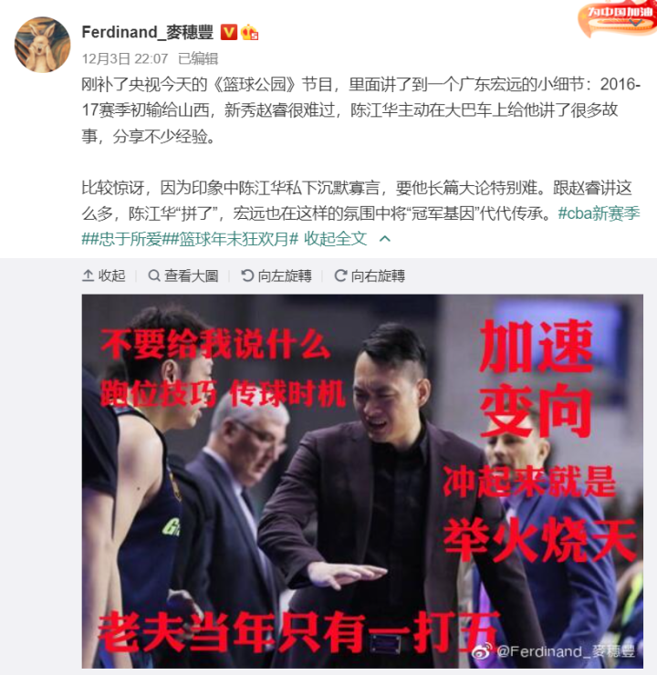 麦穗丰表示,陈江华私下一直很沉默寡言,愿意跟赵睿“长篇大论”,实属不易。因此,广东队能够成为一支冠军级别的强队,少不了一代又一代的球员传承经验,这就是所谓的“冠军基因”。