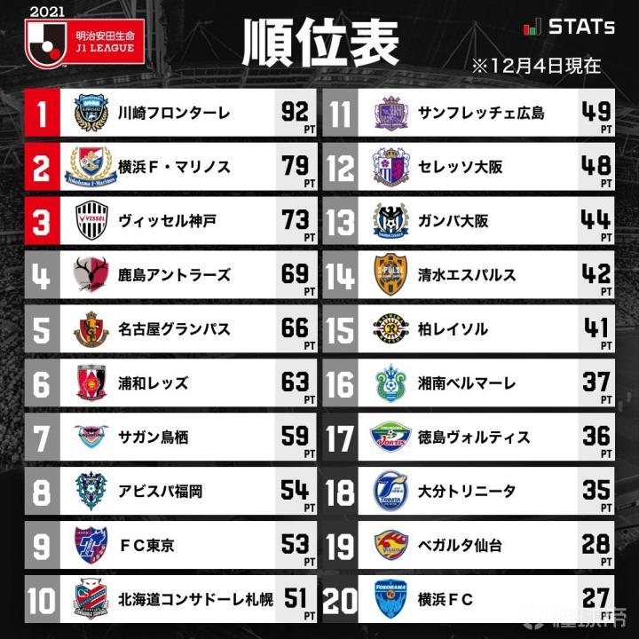 北京时间12月4日,2021赛季J1联赛的全部38轮比赛正式落下帷幕。德岛漩涡主场2-4不敌广岛三箭,未能上演保级奇迹,埃塞基耶尔梅开二度;横滨水手主场1-1战平川崎前锋,前田大然和达米昂均打入23粒进球,并列本赛季射手榜第一;鹿岛鹿角客场1-0小胜仙台,获得第四;名古屋鲸鱼主场0-0和浦和红钻握手言和,分别获得联赛第五和第六。