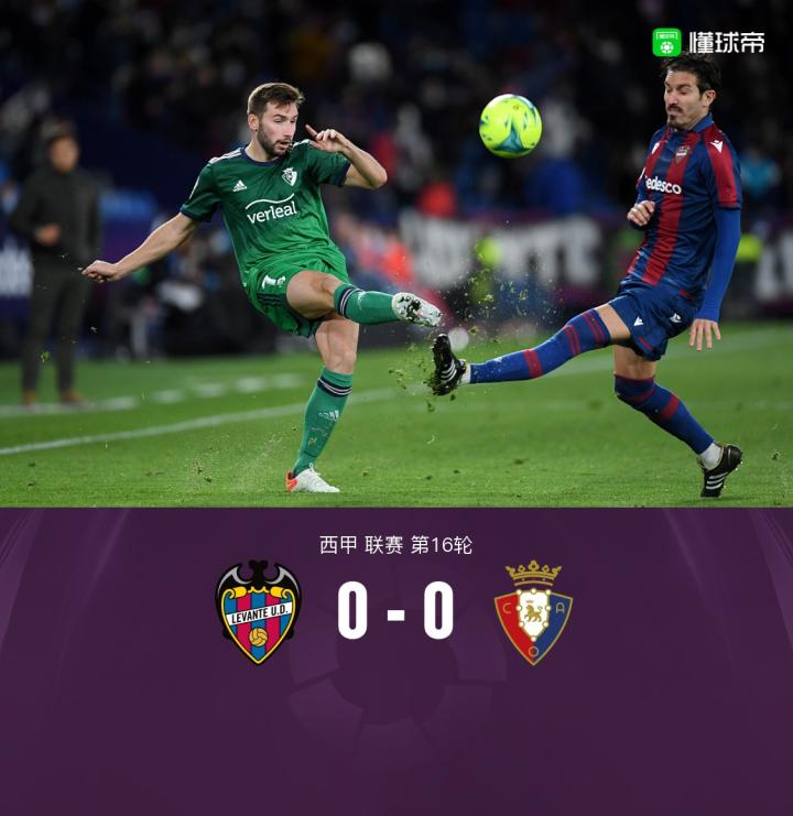北京时间12月6日1:30,西甲第16轮,莱万特主场对阵奥萨苏纳。上半场,马尔蒂铲射被扑,德弗鲁托斯捅射中柱。下半场,路易斯-阿维拉中场吊射被门将没收,德弗鲁托斯推射打偏,最终,莱万特0-0奥萨苏纳,莱万特跨赛季西甲24场不胜。