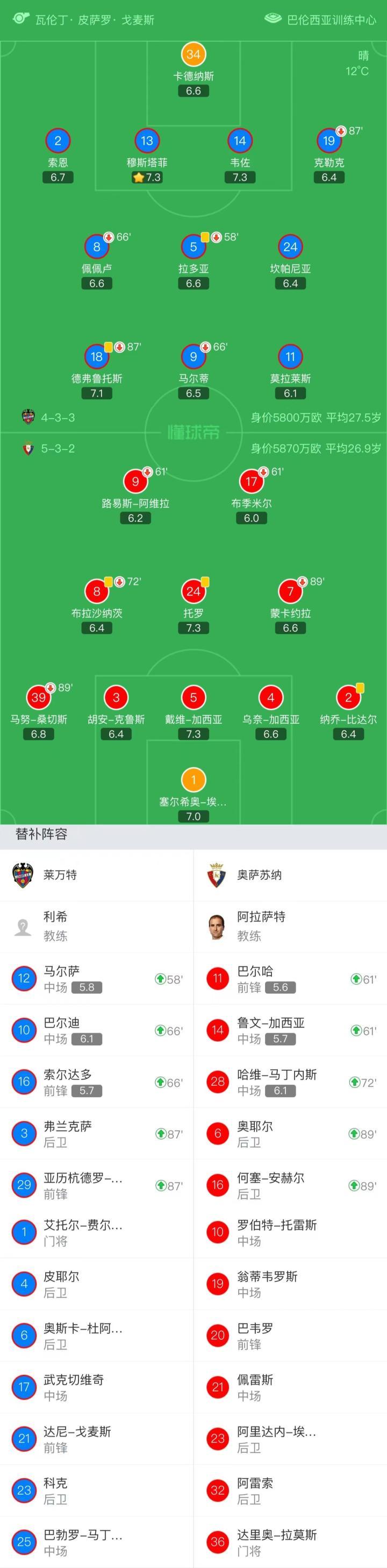 莱万特首发:34-卡德纳斯、2-索恩、13-穆斯塔菲、14-韦佐、19-克勒克、8-佩佩卢、5-拉多亚、24-坎帕尼亚、18-德弗鲁托斯、9-马尔蒂、11-莫拉莱斯