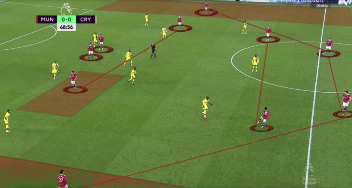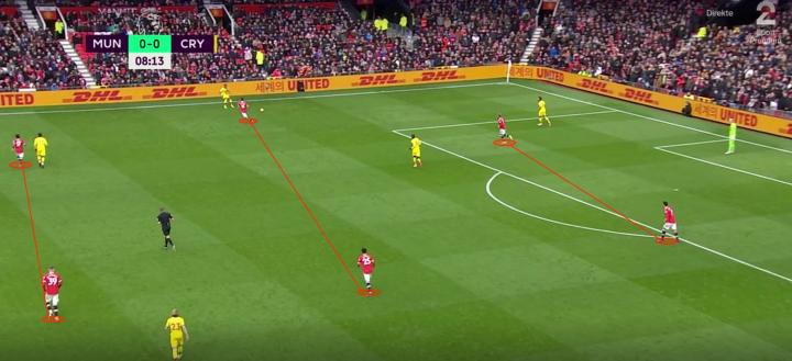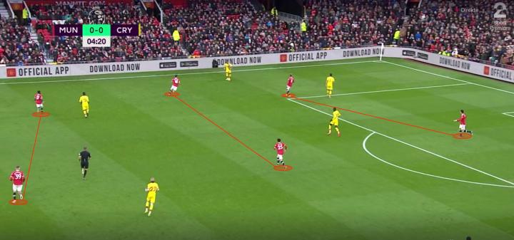 朗尼克4222阵型的几个特点: 主动、高侵略性、高强度的压迫反抢 全区域尝试控制比赛 不必要情况下避免横向传球以及回传球 有目的的控制球权 快速的纵向战术打法 边后卫允许用中长传寻找锋线球员从而推进进攻,或者进入到对手半场参与进攻 双后腰给后卫线提供保护,并且可以回撤到中后卫两边,从而允许边后卫前压 双前腰作为中场与锋线的连接,同时可以争取锋线出来的二点球,另外就是可以在进攻半场与6号位球员、边后卫和锋线球员形成人数上的优势 双前锋可以纵向冲击对手防线身后,可以回撤与前腰球员形成区域配合