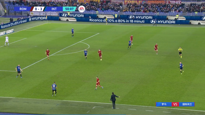 国米防守的右肋,也就是布罗佐维奇的右侧空当,是罗马本场比赛的主要攻击思路,这一侧,因为巴雷拉的落位十分靠前,所以他身后的区域,有时候会变成防守真空,利用扎尼奥洛的冲击力,开场连续冲了两次,也冲出了效果,利用他在对抗上的优势,去过掉布罗佐维奇,然后直冲丹布罗西奥的防区,肖穆罗多夫的头球,也惊出了国米球迷一身冷汗。其实这样的部署,算是打了国米一个措手不及,因为在此前的比赛里,对手更多针对的都是国米的左路,也就是恰尔汗奥卢所在的这一侧,而罗马突然掉转矛头,主要原因还是在于,首发的右翼卫是伊巴涅斯。